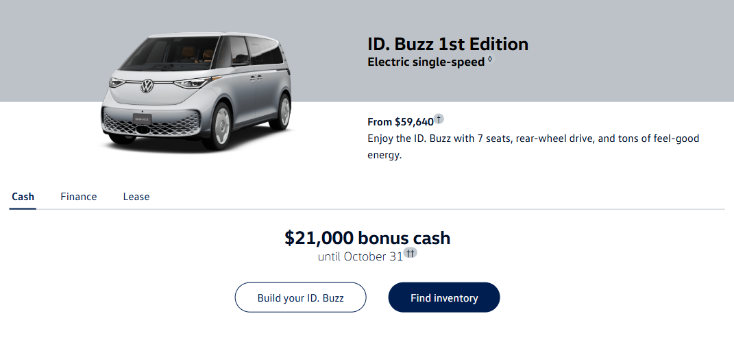 Volkswagen has dramatically reduced the price of the ID.Buzz, making it far more competitive for the Canadian market. The RWD 7-seat version now starts at $59,640, while the AWD 6-passenger model begins at $65,140 after a huge $21,000 discount. This discount is specifically for customers looking to purchase a new ID.Buzz with cash or by securing their own financing.